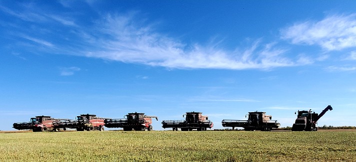 We actually have 5 Class VIII combines however most of the time we cannot find enough "combine pilots". Another reason many days for running less is grain transport, we just cannot haul grain fast enough on a good crop.